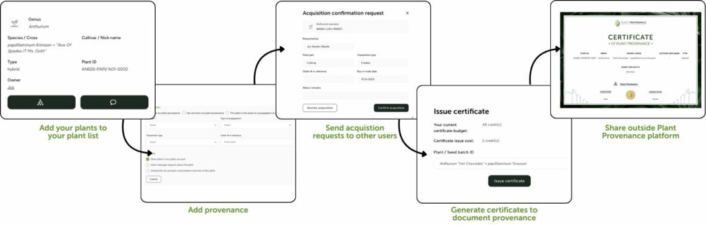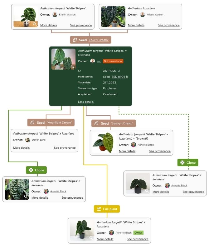 This process creates a complete plant provenance tree, with confirmed steps marked by a solid line and unconfirmed ones by a dotted line. When you generate a Plant Provenance Certificate (PPC), you’re formalizing the information in the provenance tree.
